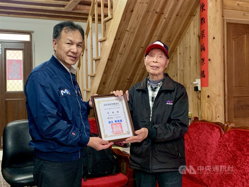 大木作匠師陳元元(右)今年10月獲連江縣政府公告,為文化資產保存技術並認定為保存者,11日下午接受縣長劉增應(左)頒發證書。圖/中央社