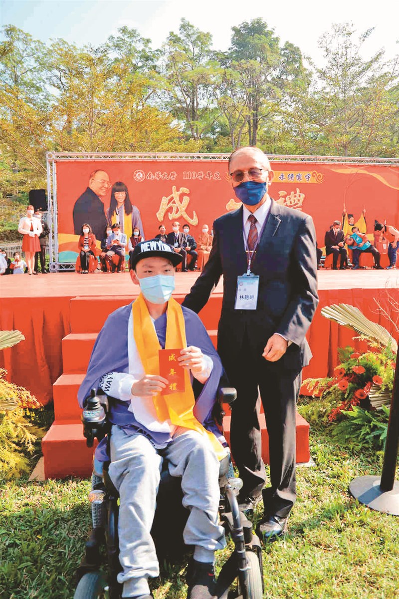 林聰明特別為就讀應用社會學系、患有先天性腦性麻痺的曹彥彬進行成年禮儀式;曹彥彬與雙胞胎妹妹,因早產而成為腦麻患者,雖肢體不便,但開朗的他總是樂觀面對挑戰。