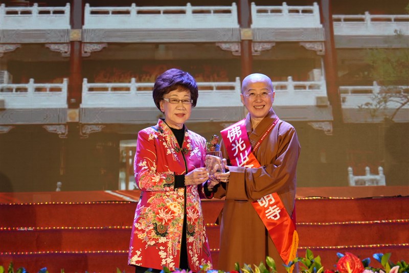 第22屆「國家建築金獎」今(13)舉行頒獎典禮,佛光山金光明寺具體落實星雲大師「寺院學校化」理念,獲頒「公共建設優質獎—宗教建築組」殊榮,圖為前副總統呂秀蓮頒獎給金光明寺住持覺培法師。圖/台灣永續關懷協會提供主辦單位台灣永續關懷協會理事長張清芳致詞時指出,22年前是因為921大地震,發現台灣建築品質堪憂,開始成立「國家建築金獎」,希望藉由這個平台提升建築品質,第一階段是評選民間建築,之後陸續涵蓋公共建築與綠能建設項目,即盼每類建築都能符合安全和社會期待。