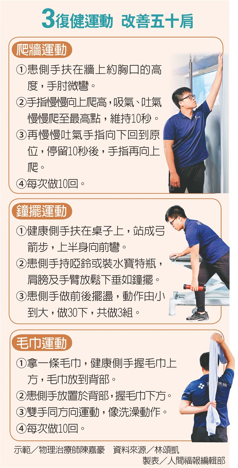 【本報台北訊】手抬不高、無法舉手穿衣服、內衣扣不起來…,小心五十肩找上你!運動醫學名醫、聯新國際診所院長林頌凱表示,五十肩常發生在五十歲左右的女性身上,多因更年期女性荷爾蒙減少、肌力退化,容易導致肩關節沾黏、肌腱發炎疼痛,肩膀活動範圍受限,除了接受治療外,可以透過「爬牆運動」、「鐘擺運動」、「毛巾運動」三種復健運動,來自救解疼痛。