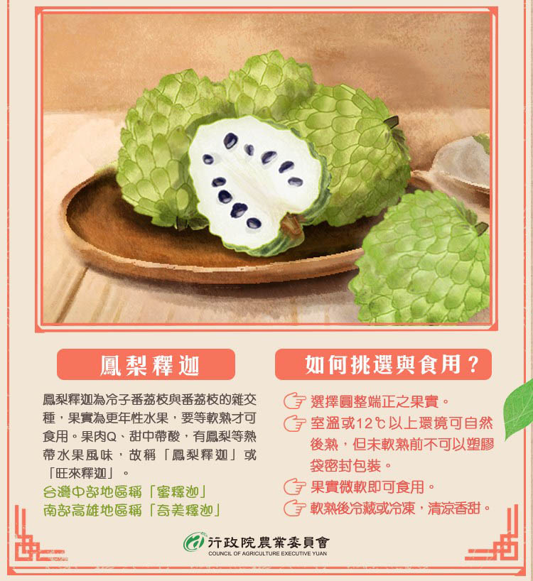 鳳梨釋迦冷凍後更好吃 看知識抽釋迦禮盒 |2021.12.16 語音朗讀 2608觀看次 字級 大 中 小 圖/行政院農業委員會 影音/行政院農業委員會【記者楊旻芳台北報導】每年12月到隔年的4月,是鳳梨釋迦「正著時」的盛產季,這時候的鳳梨釋迦果實最為鮮美好吃,行政院農業委員會「當季好吃跟我走」深入釋迦產地台東,讓鳳梨釋迦達人教學釋迦要怎樣挑、怎樣吃最好吃。現在農委會也舉辦抽獎活動,只要在農委會粉絲專頁或臉書依規定留言,就有機會獲得鳳梨釋迦鮮果禮盒共8盒。圖/行政院農業委員會傳統釋迦跟鳳梨釋迦怎麼區分?台東區農業改良場副場長盧柏松表示,釋迦已經在台東縣發展5、60年了,品種非常多,最常見的有傳統釋迦跟鳳梨釋迦,這兩種釋迦要怎麼區分?非常簡單,就看你能不能「用手剝開」來吃。可以用手剝開方便食用的就是傳統釋迦,鳳梨釋迦無法用手剝開,須借用刀器剖開才能享用。而光是鳳梨釋迦就有Hillary、African Pride、黃金、蜜寶、綠鑽、鳳梨釋迦,以及最近推出台東3號等7種品種,另外台東1號跟台東2號就是就是常見的大目釋迦,目前市場上較常見的品種是台東2號跟鳳梨釋迦。圖/行政院農業委員會圖/行政院農業委員會台東縣是台灣主要的鳳梨釋迦產地,果肉Q彈、口味甜中帶酸,有鳳梨或百香果等熱帶水果的綜合味道,所以被稱為鳳梨釋迦,甜度可高達23到25度,因甜度較高,也有人叫做蜜釋迦。每年的12月至隔年4月是鳳梨釋迦的盛產季,這時候的品質比較穩定、比較好。鳳梨釋迦怎麼挑?斑鳩釋迦產銷班班長吳文耀表示,鳳梨釋迦挑選時不要選顏色太深綠,果實呈現黃綠色表示成熟狀態,鱗目(釋迦凸起之處)要比較平坦,沒那麼尖,鱗目愈平、表示愈成熟,另外可以用輕壓的方式,看果實軟了沒,來分辨說能不能吃,通常尾巴會比較快熟,所以是按壓頭部,有微軟就是可以吃了(有蒂頭的是頭部)。鳳梨釋迦買回家如過尚未成熟,不能放在太冷的地方,建議放在13度以上的溫度,大約是室溫溫度,正常5-7天就會成熟。如果喜歡吃較Q的果肉,不用等太熟,按壓微軟就能吃。如果喜歡較軟的口感,可以放到壓起來較軟的時候再吃,這個時候甜度就很高。圖/行政院農業委員會鳳梨釋迦可以冷凍再解凍吃?斑鳩釋迦產銷班廠長陳進憲說,鳳梨釋迦如果量多,可以放熟後冰進冷凍庫,大約是-20度的溫度,拿出來後微波40秒或放在室溫30分鐘,就可以切開來吃。他表示,冷凍釋迦的風味會更不一樣,可能會覺得比鮮果更好吃。 前一篇文章 山藥穩血糖、降三高 營養師:這種人不能多吃 下一篇文章 北科大推木工體驗 木創文化向下扎根 熱門新聞 01故宮特展神獸再現 麒麟、鳳凰登場 2026.03.2402【詩】白花鬼2026.03.2503南華大學茶禪雅集 靜坐書寫時光膠囊2026.03.2604星雲大師靈骨分燈歐洲 傳燈萬方2026.03.2605佛光山365日越文版 贈西貢日航大酒店2026.03.2706星雲大師靈骨分燈北美 法脈永傳2026.03.2407中南部水庫水位告急 各地農損頻傳2026.03.2408台灣工藝3專書 呈現文化獨特樣貌2026.03.2709紅綠葡萄抗氧化抗發炎 連皮吃獲取健康全效益2026.03.2710兒童節禮物 新北學生自己票選2026.03.26 訂閱電子報 台北市 天氣預報 台灣一週天氣預報 相關報導 8萬小草力挺 柯:我不投降 718億新興計畫預算 政院不動 能源漲價 央行逐季檢視通膨京華城案 柯文哲重判17年台東實彈操演 美技術人員在場非核轉彎 卓:反核非神主牌