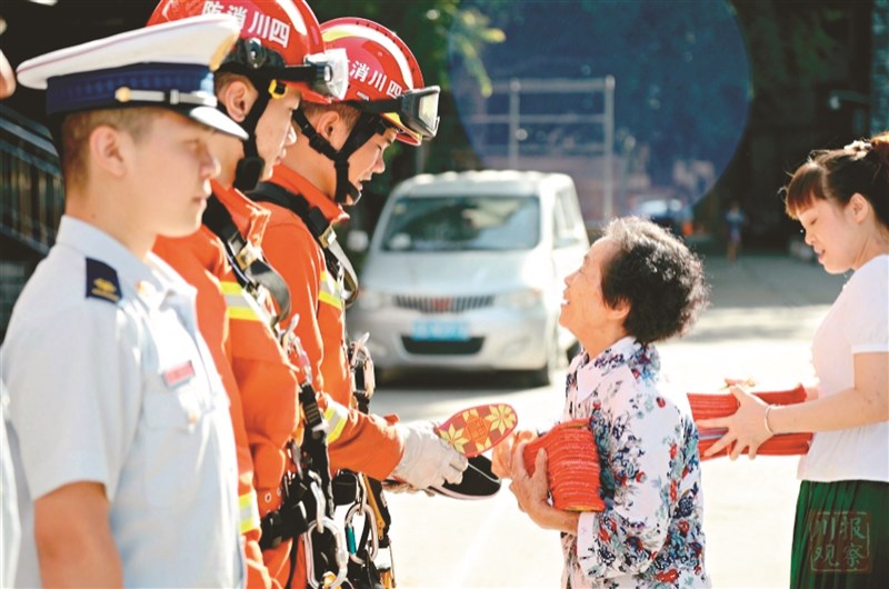 在唐明現離世的第二天,有不少民眾陸續到她生前住處悼念,而在弔唁的人群中,攀枝花軍分區、東區人民武裝部官兵代表、攀枝花市消防救援支隊公園路特勤站消防員等,在靈堂前列隊鞠躬,他們更特地穿上「布鞋奶奶」親手做的鞋墊,來送她最後一程。