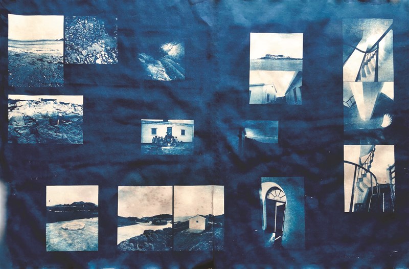 王煜松以藍晒圖為媒材創作〈在燈塔的日子〉。圖/台北當代藝術館提供