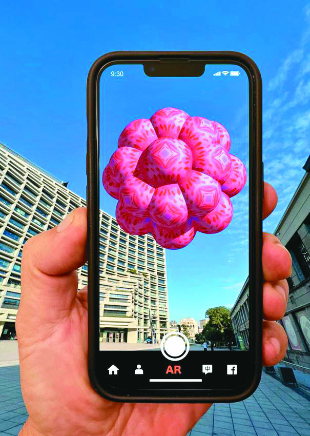 【記者曹麗蕙台北報導】台北市文化局推出「#限時動態:疫情時代下的公共藝術設置計畫」,昨起於松山文創園區展出大型地景AR(擴增實境)作品〈自由呼吸〉,民眾透過手機App,可看到松菸上空出現粉紅色能量球,也能與作品互動。
