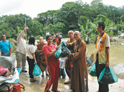 馬來西亞佛光山與星洲基金展開災區服務工作,佛光會中華總會總會長暨人間福報發行人心定和尚、東禪寺監寺慧軒法師、南馬區監寺覺文法師、關丹佛光分會會長曾忠誠、黃進寶教士一行人到文德甲達萬鎮組屋和文德甲新村慰問災民,分送白米、餅乾、麵、礦泉水等食品與救濟金,同時也在淡馬魯收費休閑站轉交救濟品給吉道原住民村代表。隨後到彭亨洲另一個重災區關丹林明關心災民。圖、文/人間社記者陳慧亮、梁秋梅