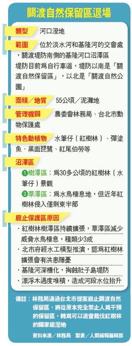 台首例 關渡自然保留區 轉型 |2021.12.22 語音朗讀 1883觀看次 字級 大 中 小 關渡自然保留區退場 資料來源/林務局 製表/人間福報編輯部關渡自然保留區近年紅樹林擴張、陸域變大,水鳥種類減少3成;關渡自然公園在關渡自然保留區範圍內,每年9月起,小水鴨等雁鳥就陸續來台灣過冬。圖/蘇健忠關渡自然保留區近年紅樹林擴張、陸域變大,水鳥種類減少3成;關渡自然公園在關渡自然保留區範圍內,每年9月起,小水鴨等雁鳥就陸續來台灣過冬。圖/網路關渡自然保留區近年紅樹林擴張、陸域變大,水鳥種類減少3成;關渡自然公園在關渡自然保留區範圍內,每年9月起,小水鴨等雁鳥就陸續來台灣過冬。圖/資料照片 【本報台北訊】關渡自然保留區近年紅樹林擴張、陸域變大,水鳥種類減少3成。農委會林務局昨天表示,為減緩溼地陸域化、解決紅樹林擴張帶來的洪泛,昨已公告廢止原依文資法設定的關渡自然保護區,轉為國家級溼地保護區,也就是說該區從原本完全禁止人為干預的保留區,轉為可以適當裁伐紅樹林的國家級溼地,該區是我國第一個退場的自然保留區。台北市政府為了保育關渡溼地中的水鳥,使種類回升,2018年提解編「關渡自然保留區」,林務局昨通過北市提案。北市動保處表示,目前關渡溼地有55公頃,6成都是紅樹林,10年內水鳥種類從130種下降到48種,未來會伐除約10公頃,但仍要送中央核定才能執行。泥灘地漸漸消失土地陸化成樹林當初關渡自然保留區是以《文化資產保存法》保護當地生態,而後有了《溼地保育法》,動保處說,紅樹林在民眾心目中是需要保護的植物,有護岸功效,但紅樹林屬於強勢物種,擴張速度相當快,關渡一開始就是要保護水鳥而設立保護區。但在禁止人為干涉的情況下無法伐除紅樹林,反而壓迫到水鳥生存棲地,因為水鳥需要利用泥灘地行走、覓食。結果造成紅樹林擴張,土地陸化成了樹林,水鳥需要的泥灘地漸漸消失。動保處指出,市府做了監測計畫和研究報告,發現還是要學習新竹香山溼地,用人工的方式砍伐紅樹林做棲地維護,但文資法相當嚴格,沒有人為管理的空間,因此才決定廢除「保留區」,改以溼地法保護關渡溼地。動保處也提到,研究也發現紅樹林須適度砍伐,因為陸化會造成河流水位上升,可降低另一頭社子島水患的危險,目前55公頃的關渡溼地中,有6成都是紅樹林,初步計畫是會伐除一部分,監測鳥類有無回來棲地生活,不過砍伐紅樹林的計畫範圍要和水利處討論,初步規畫是10公頃,明年先送中央核定,地方還須經費編列,最快在2023年執行。環團籲保留部分愛鳥人士有異見荒野保護協會台北分會長游晨薇表示樂見其成,過去一段時間,關渡溼地的紅樹林快速擴張,嚴重壓縮鷸鴴科水鳥的覓食空間,若改用溼地保育法接手淡水河流域的保育工作,未來將有更多管理彈性,並創造棲地多樣性,水鳥種類也會增加。游晨薇也強調,關渡溼地屬於內陸型、都會區環境,還是要透過人為維護才能做好更多保育工作,其中紅樹林疏伐應有一定適當的比例,不建議全數砍除。資深觀鳥者、關渡自然公園管理處前處長何一先則指出,關渡自然保留區解編問題已討論十多年,當地過去設為自然保留區,主要目的是為了保護水鳥,而非為了紅樹林,因此未來若要疏伐也不必特別保留比例,畢竟淡水河還有紅樹林自然保留區、挖子尾自然保留區,面積也都不小。 前一篇文章 緬甸單親媽 圓大學夢助新住民 下一篇文章 疫情下 中美人口增長率 創歷史新低 熱門新聞 01佛光山月光寺啟用 花蓮心靈新地標2026.03.2902推動科學辦案 鑑識權威李昌鈺87歲辭世2026.03.2903道奇頒冠軍戒 大谷喊要更多枚2026.03.2904中職開幕戰 猿隊險勝兄弟2026.03.2905川普誇耀政績 陸採購大豆倍增2026.03.2906最大規模無王日 逾3200場反川示威2026.03.3007汽油飆漲 1.7 元 創 11 年半新高2026.03.2908宜蘭綠博會 探索真理2026.03.3009陸首都維安 北京全面管制無人機2026.03.3010MLB 鄧愷威轉隊太空人 初登板奪首勝2026.03.30 訂閱電子報 台北市 天氣預報 台灣一週天氣預報 相關報導 暌違逾半世紀 NASA載人繞月川普:美伊戰爭2~3周結束川普傳放棄重啟荷莫茲 提前停戰鄭習會4月登場 盼兩岸迎暖春美首批陸戰隊抵中東 地面戰在即汽油飆漲 1.7 元 創 11 年半新高