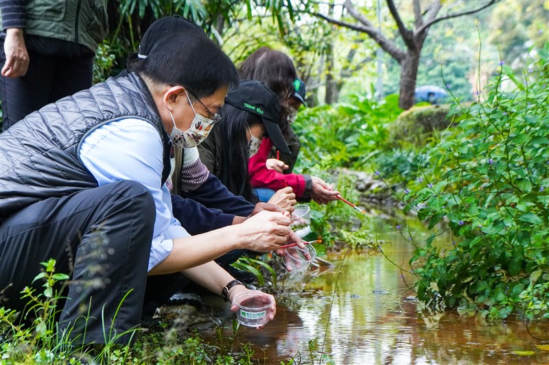 台大校長管中閔於校內農場水圳旁野放黃緣螢幼蟲,盼明年春天的夜晚臺大校園能見到螢火蟲閃閃飛舞的景觀。圖/台大提供