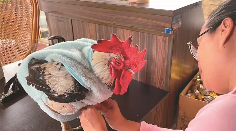 屏東縣新園鄉有隻兩歲寵物公雞,備受家人關愛,冬天還會給牠穿上毛衣保暖。圖/中央社