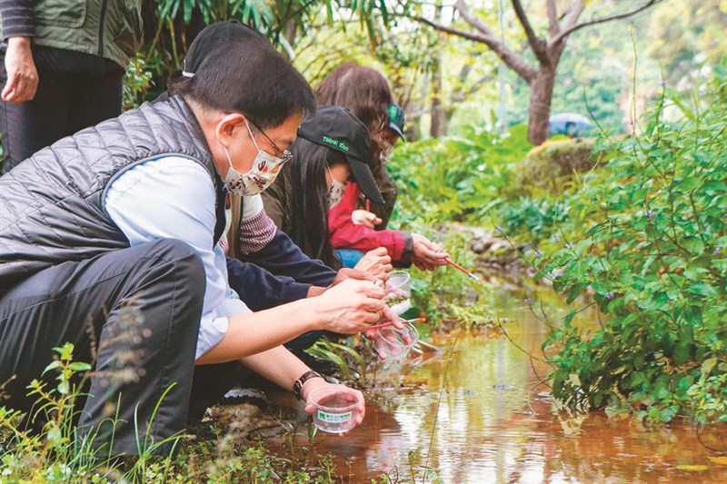 台大校長管中閔昨於校內農場水圳旁,野放黃緣螢幼蟲。圖/台大提供
