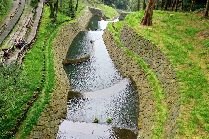 嘉義林管處表示,整治工程設有馬蹄型溢洪口、亂石疊砌跌水工及植石護坦等多樣構造物,可減緩沖蝕並營造垂瀑等視覺景觀;而緩坡砌石護岸更有助於動物往返水陸域環境,確保多元棲息環境。