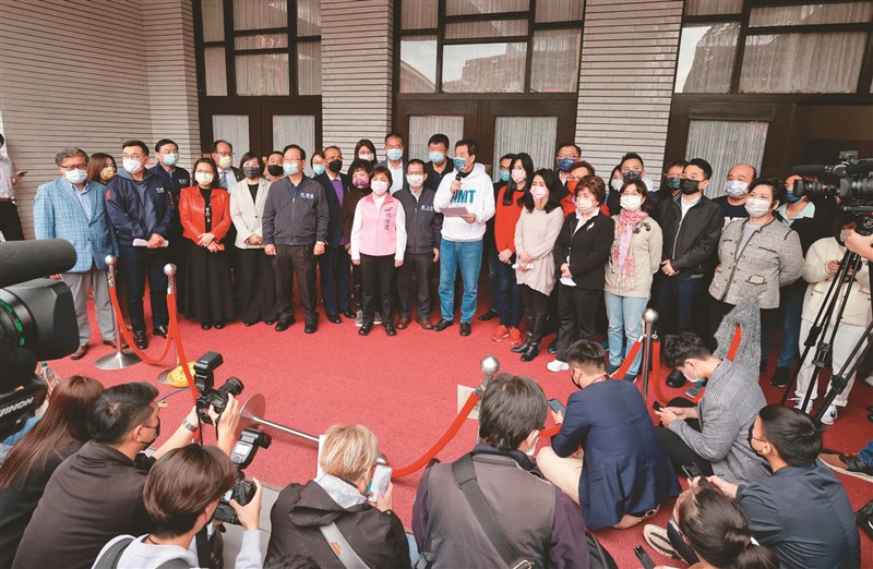 針對民進黨將總預算案逕付二讀,立法院昨天朝野協商前,國民黨團在議場前說明立場。圖/鄭超文