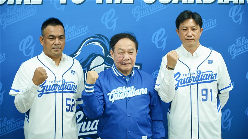 富邦悍將今舉辦記者會公布一二軍教練團名單,由左至右為二軍教頭陳金鋒、領隊林華韋、一軍教頭丘昌榮。圖/記者張睿杰