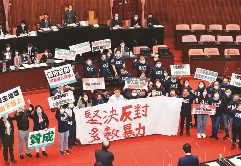 民進黨團擬將《地制法》修法草案逕付二讀,在野黨聯合抗議杯葛,以布條及標語表達訴求,最後送回委員會審查。圖/中央社