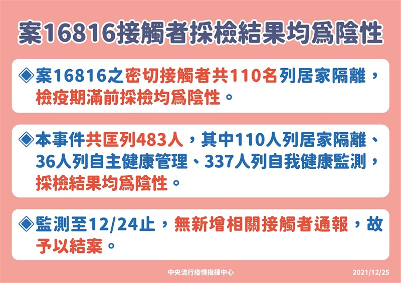 【本報台北訊】日前中研院前助理研究員確診,案號為16816,已比對確診者病毒株與實驗室病毒株,屬於Delta變異株。中央流行疫情指揮中心發言人莊人祥表示,該事件共匡列483人,截至昨日12月24日無新增感染者,宣布結案。