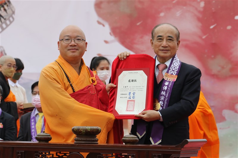 佛光山住持心保和尚(左)頒發感謝狀給中華傳統宗教總會總會長王金平。圖/人間社記者梁清秩