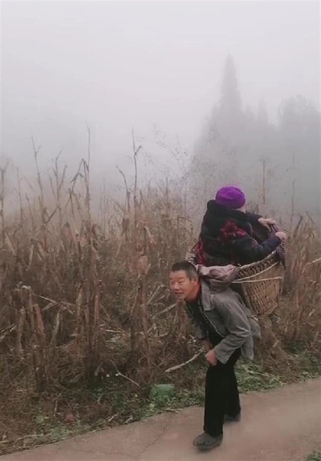 劉男說,日前張男要帶母親去市裡的醫院看病,託劉先生開車來接。劉先生開車到村音時,因為不平整,高坡也多,車子無法停到其家門口。於是,張男就用大筐簍把母親背出了家,步行爬了一個大約500公尺的長坡才到車前,劉先生看了覺得很感動,就拍了下來。