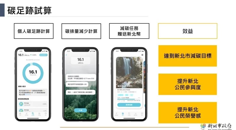 配合新北永續及減碳目標,未來新北幣的專屬APP還將透過計算民眾步行、搭乘大眾運輸等計算碳足跡,來提供新北幣的減碳獎勵。圖/新北資訊中心提供