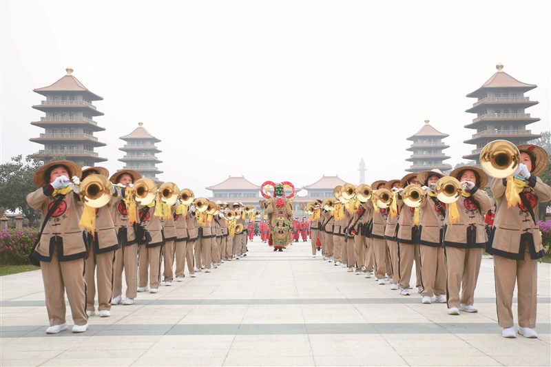 昨日在佛館,哨角隊吹哨角作鑾駕前導,隨後千里眼、順風耳將軍為媽祖護衛,駕前開路,媽祖神尊的鑾轎才現身,莊嚴的隊伍綿延在成佛大道上,虔誠朝禮佛祖,參加十年來從不間斷,成為世間最虔誠的信仰力量。