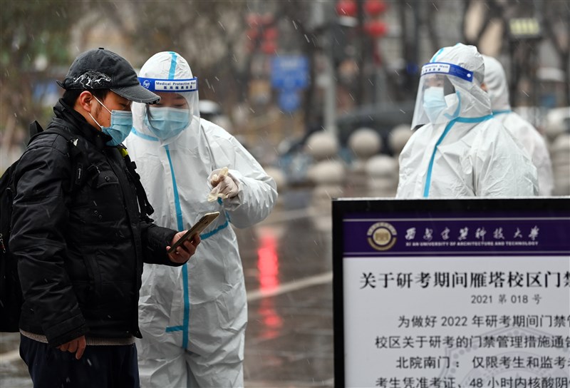 大陸陝西疫情持續升高,防疫人員查看研考生的核酸檢測結果。圖╱新華社