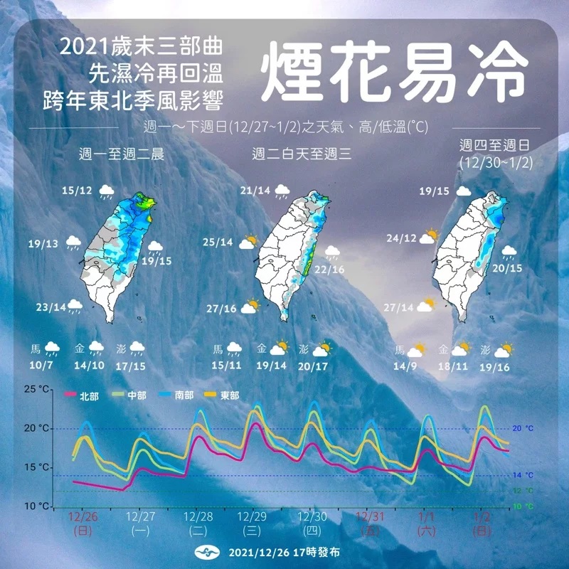 周四起東北季風增強,周五跨年夜、周六元旦因東北季風影響,北部及東北部地區天氣較涼,中南部早晚亦涼,日夜溫差大;東半部地區、北部山區雲量多、易有局部雨。