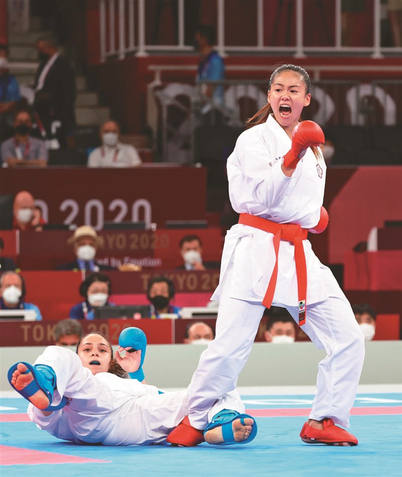 「小清新」文姿云(右)報平安,「我平安喔」!圖為文姿云在二○二○東京奧運女子空手道奪得銅牌。圖╱資料照片
