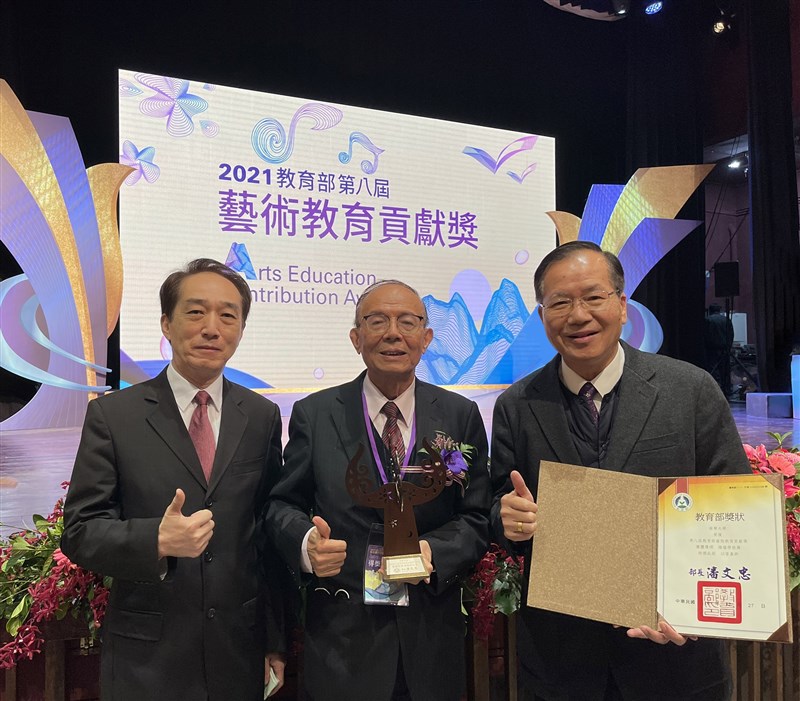 南華大學二度榮獲藝術教育貢獻獎績優學校獎,林聰明校長(中)出席頒獎典禮接受表揚,右為林辰璋副校長,左為藝文中心馮智皓主任。圖/南華大學提供