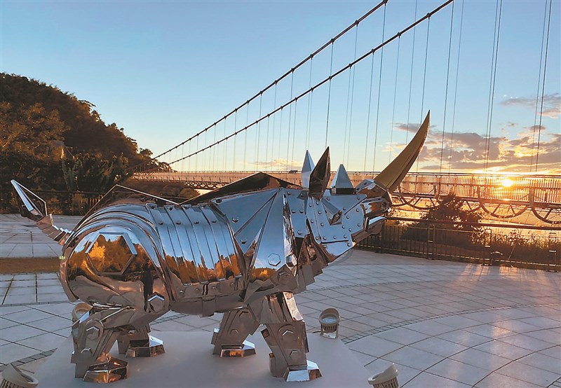 施力仁的犀牛雕塑作品,搭配太平雲梯夕陽。