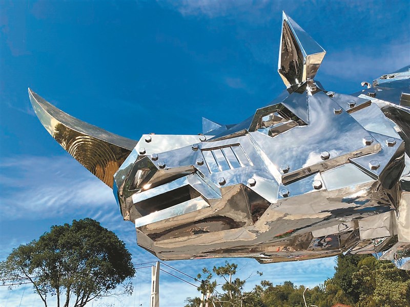 藝術家施力仁以犀牛為創作題材,以不銹鋼的銀色鏡面鑄造,犀牛角則使用鈦合金,透過犀牛雕塑傳達祥瑞與力量。