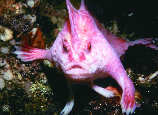 澳洲塔斯馬尼亞州外海發現一條極罕見粉紅色手魚,能利用超大雙鰭「行走」。圖/取自網路