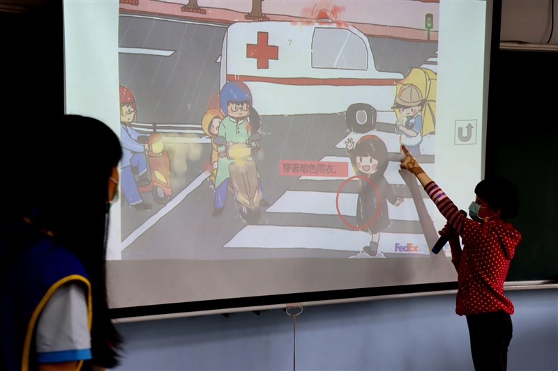 在聯邦快遞視訊與和平會社工現場引導互動下,孩子對著銀幕指出路上可能面臨的危險,如雨天不宜穿著暗色雨衣,或透過繪本《慢小黃出任務》的角色,灌輸 「慢慢行」的好處,包括享受周遭的美好景色和培養敏銳觀察力、應變各種突發道路狀況。