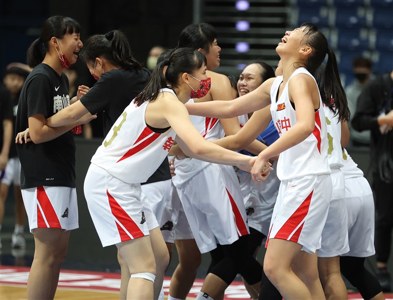南山女籃末節剩4.4秒才靠著陳孜綺騎馬射箭驚險1分差擊敗苗商,賽後球員慶祝搭上8強末班車。圖/名衍行銷提供