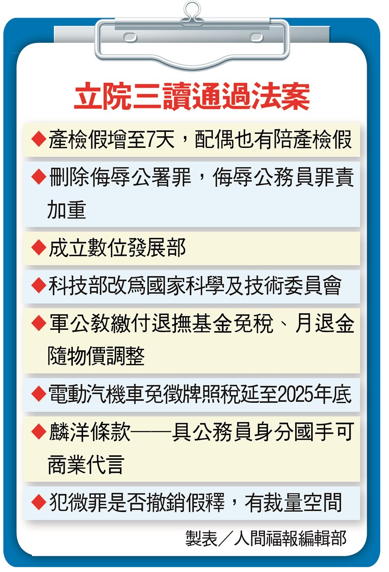 立法院昨也三讀通過《數位發展部組織法》及行政院組織法修正案,確定成立數位發展部,專責整合電信、資訊、資安、網路與傳播等五大領域,預計明年初掛牌上路。