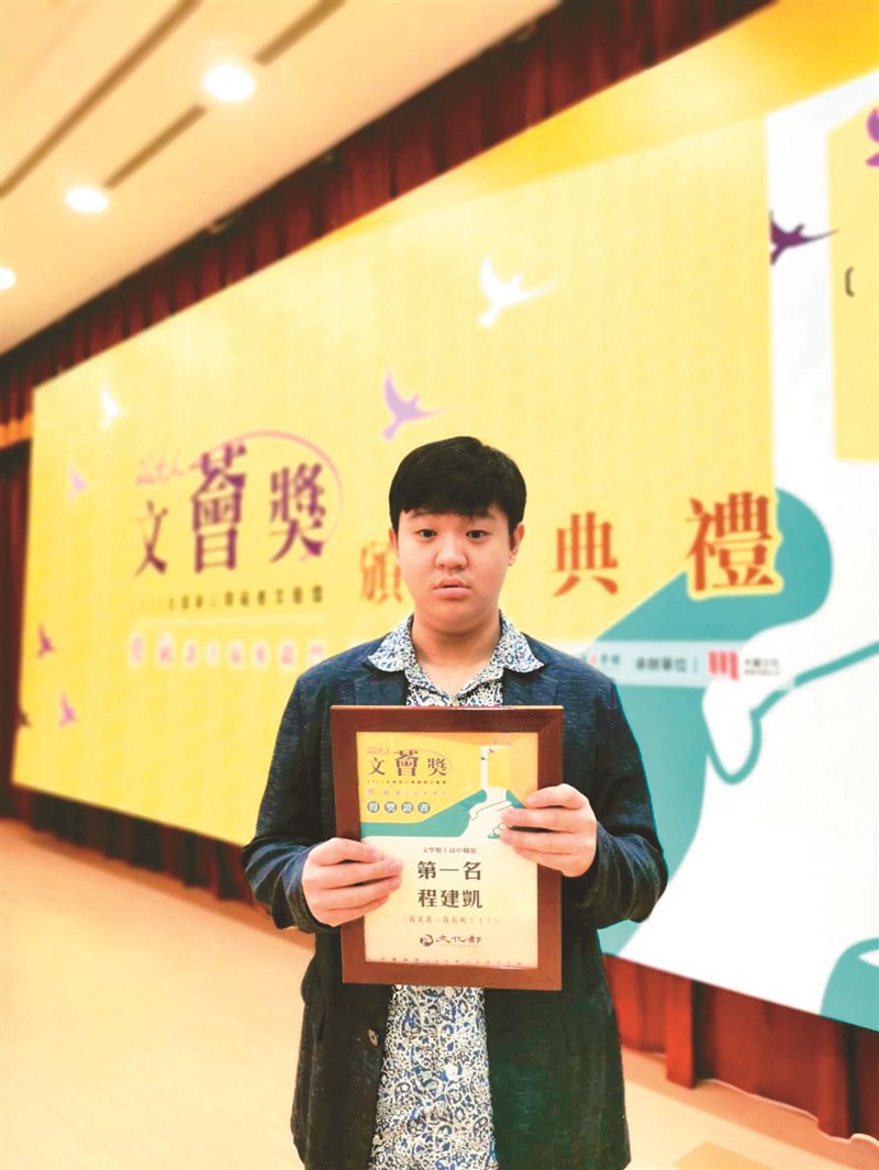 【本報綜合報導】高雄市立成功特殊教育學校十八歲學生程建凱,是口不能言的重度自閉症患者,但他從不認為自己有障礙,靠著「一指神功」在鍵盤上敲打字音,寫出動人文章,今年獲「文薈獎」文學類高中職組第一名。