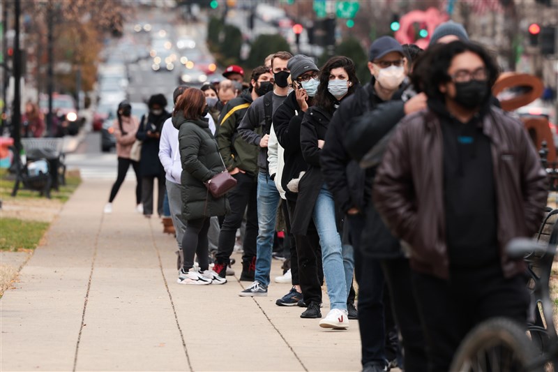 在華盛頓特區的法拉古特廣場,民眾排隊等候新冠檢測。圖╱法新社