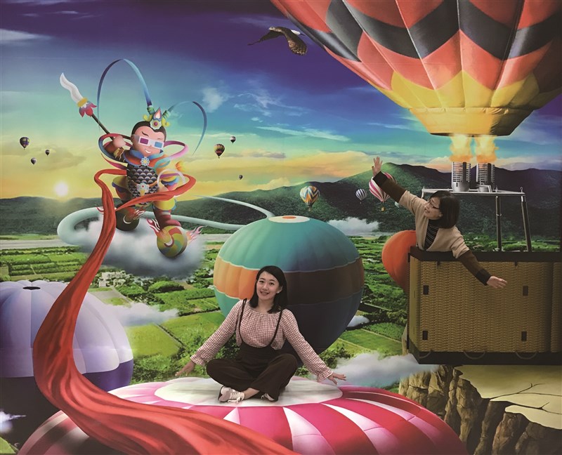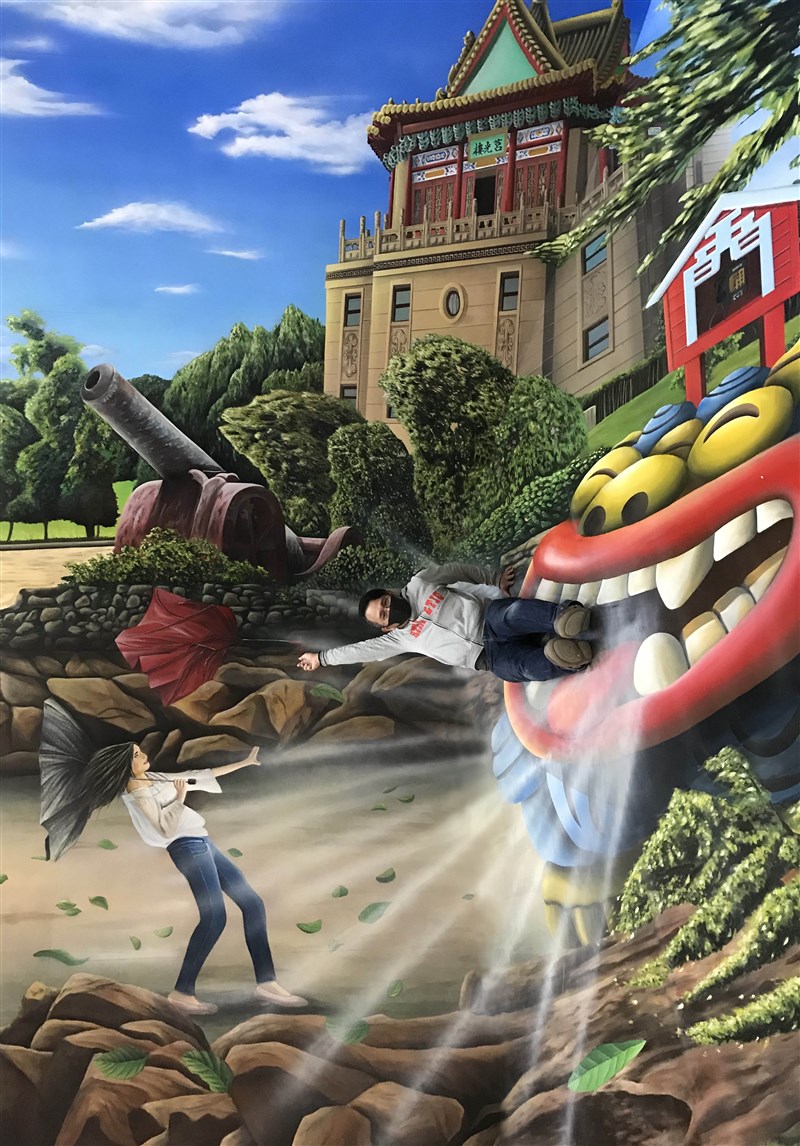 3D藝術展作品「中正紀念堂喜遇三太子」。圖/文化部提供策展人蔡文祥說,這次分別邀請來自嘉義的牌樓民俗彩繪藝術匠師陳明山,以及高雄的想像空間藝術設計工作室一起合作,現場6幅精彩作品和入口彩繪牌樓,都是這群藝術家們不眠不休、一筆一畫的手繪創作,包括有台南「七股鹽山滑雪趣」、宜蘭「悠遊龜山島」、台東「熱氣球嘉年華」、南投「清境綿羊同樂會」、台北「中正紀念堂喜遇三太子」,及金門「風獅爺大風吹」等3D藝術創作。