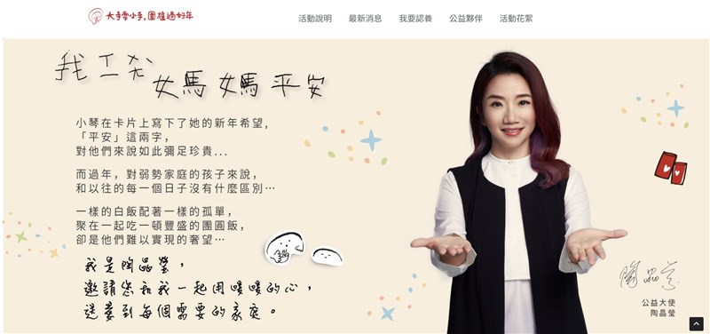 為此基金會舉辦「大手牽小手,圍爐過好年」的活動,邀請民眾認捐年菜、紅包、禮物,然而捐贈不如預期,因此發文希望明年1月14日以前順利募齊,及時將佳餚送上弱勢家庭的餐桌。而看到弱勢家庭的困境,許多企業挺身而出,如家電品牌DIKE加碼,只要認捐年菜滿8道都有多功能陶瓷電煮鍋。