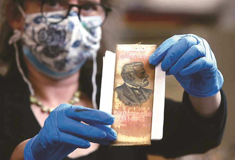 維吉尼亞州歷史資源局人員,展示在膠囊內發現的李將軍肖像緞帶。圖/美聯社