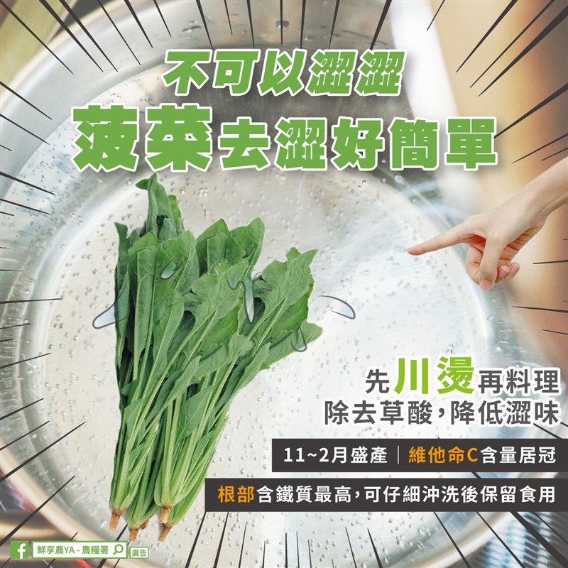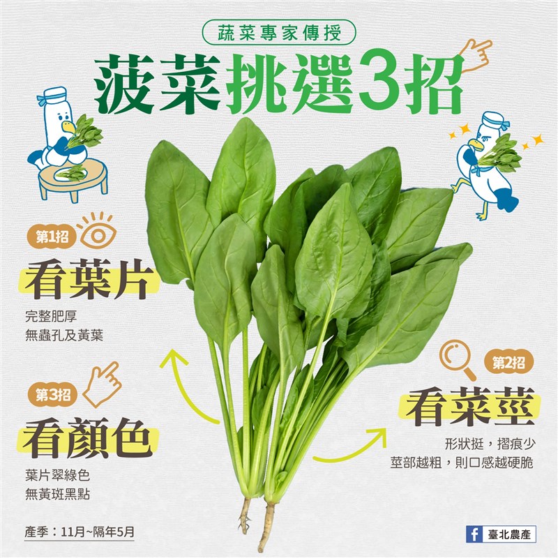 蔬菜之王很營養 菠菜去澀好簡單 |2021.12.30 語音朗讀 1570觀看次 字級 大 中 小 菠菜去澀好簡單。圖/農糧署 【記者楊旻芳台北報導】菠菜被稱為蔬菜之王,有豐富的鈣、鐵、蛋白質、β-胡蘿蔔素等營養,但煮起來卻容易有澀澀的口感,吃完嘴巴總是覺得不太舒服。農糧署分享,煮菠菜有一個小撇步,就是先「川燙」再料理,就可以讓菠菜「去澀」,多一個步驟就能讓菠菜吃起來口感升級!菠菜小檔案新莊公有市場賣菜郎廖炯程分享,菠菜又叫波薐菜、赤根菜、鸚鵡菜,秋冬是最主要的產季。農糧署表示,在市場買菠菜大多會以「台語」名稱來稱呼,叫「pue-lîng-á 菠薐仔」。廖炯程說,大家對蔬菜的印象大多是美國的大力水手卜派吃了菠菜罐頭,就會變成大力士的神奇角色。其實背後原因是當時美國正逢「經濟大蕭條」,要推廣這種易種、快採收,營養豐富的菠菜來養活人口,但是大家吃不慣這種澀味的菜,而創造出引領風潮的精神人物,家家戶戶看著漫畫,配著卡通,連小孩都吵著要吃菠菜罐頭了!圖/廖炯程提供菠菜的營養農糧署表示,菠菜富含鈣、鐵、蛋白質、β-胡蘿蔔素、葉黃素與玉米黃素等營養,維他命C含量更在蔬菜類中名列前茅,因此又被稱為「蔬菜之王」,有強健骨骼、保健視力及心血管等多種好處。而菠菜又以「菠菜根」鐵質含量最多,但一般人沒有食用根部習慣,建議可以切除1公分後,以清水浸泡沖洗淨後直接料理。料理祕訣 先川燙、再料理不過,由於菠菜所含草酸較多,吃氣來會有澀澀的感覺,引此建議「先川燙、再料理」,便能有效去除大部分草酸、不再澀,且減少磨牙的口感,更加享受菠菜鮮甜好滋味。菠菜挑選原則圖/臺北農產菠菜盛產季為每年11月至隔年5月,挑選時可先看葉片完整肥厚,無蟲孔;再來看顏色,葉片翠綠無黃斑黃葉為最佳;菜莖形狀挺,摺痕少,莖部越粗,則口感越硬脆。廖炯程補充,若看到根部很長的,恭喜你遇到高山菠菜,僅貴個十來塊,絕對要入手。圖/廖炯程提供圖/廖炯程提供最後要注意,購買時盡量挑選葉面乾爽無水的較好,因為有些菜商會在表面灑水,讓菜看起來新鮮活力有朝氣,但是會變得不易保存。 前一篇文章 新聞千里眼 下一篇文章 高鐵春節車票開賣 4分鐘訂近6萬張 熱門新聞 01【分數之外】看見另一種英文2026.04.0802租賃車業者違法攬客 觀光署:最高罰200萬元2026.04.0703清明豪雨 合歡溪出現新堰塞湖2026.04.0904杉林溪園區 紫藤花盛開2026.04.0805計程車掛牌費喊到35萬元 交部出手2026.04.0806火金姑故鄉 賞螢好去處2026.04.0907哥國動盪城 變身世界圖書之都2026.04.0808【練瑜伽品生活】英雄式二 英雄不能只看正面2026.04.0809美伊談判 45天停火協議2026.04.0710吃素也能大補「鐵」 開心果芝麻含量豐2026.04.08 訂閱電子報 台北市 天氣預報 台灣一週天氣預報 相關報導 大型建案強制裝光電 藍提案喊卡鄭:若執政 恢復兩岸故宮交流海軍新造浮塢下水 後勤能量提升鄭麗文抵北京 鄭習會今登場鄭謁中山陵 公開提中華民國鄭麗文會宋濤:兩岸非註定一戰