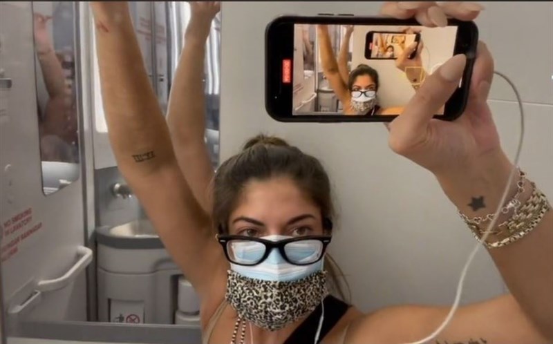 美國一名女老師因爲在機上測出新冠陽性,自願關在廁所隔離5小時。圖╱取自tikto