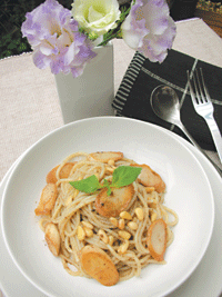 4. 撒上一小把松子及新鮮九層塔葉片,蓋鍋燜一下即完成。