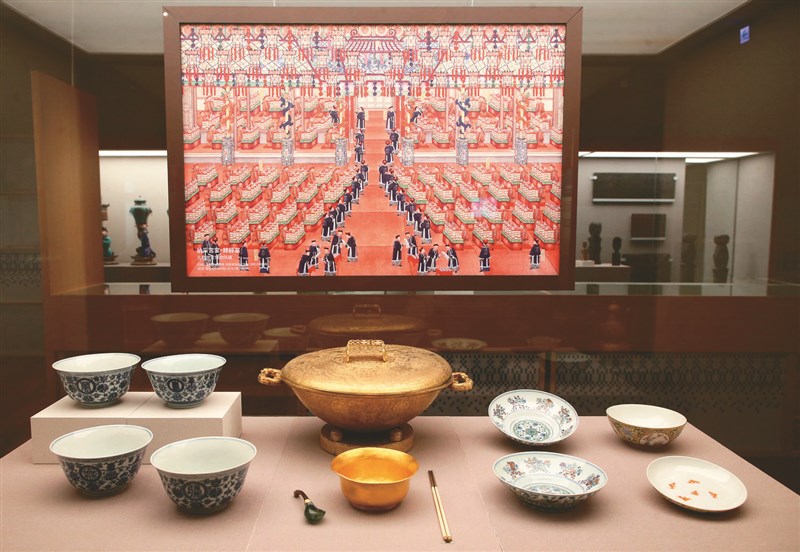 故宮、台博、台史博三館聯合特展結合三方館藏特色,呈現台灣歷史上原、民、官三個重要角色;圖為故宮典藏的清皇宮福壽雙喜龍鳳金鍋(中)等餐具。圖/胡經周