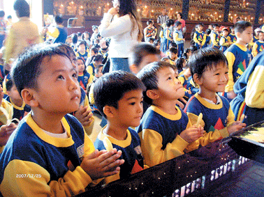 山,佛光山上風景好,有樹木、有寶橋、有觀音、有地藏,接引大佛最雄壯…」屏東民生國小校長李光榮二十五日帶領二百五十位師生到佛光山校外教學,小朋友開心地唱著,佛光山的清淨莊嚴讓孩子的心也變得祥和歡喜。