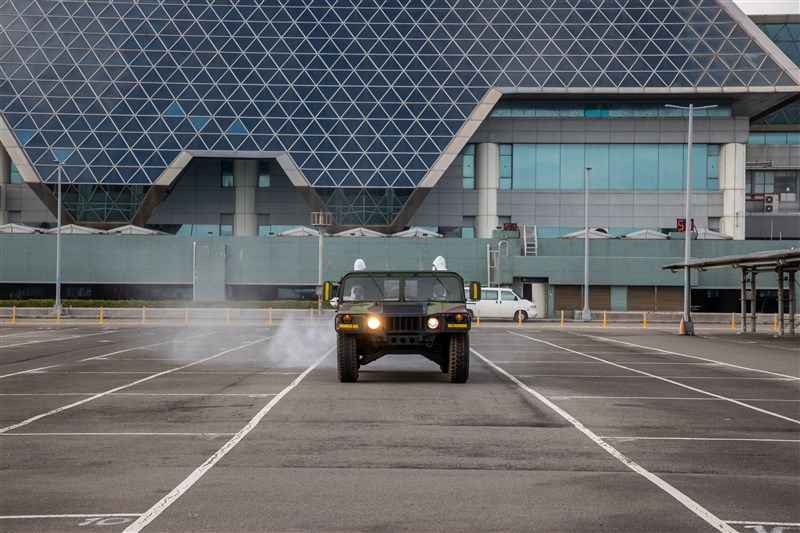 桃園機場爆發群聚感染,今再增一名清潔員確診,國軍33化學兵群昨(4)日前往桃機P3停車場進行消毒。圖/季相儒