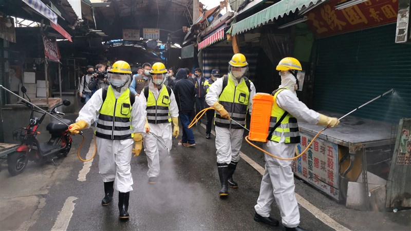 桃園市府防疫消毒大隊與33化學兵擴大忠貞市場及周邊大範圍清消防疫。圖/曾增勳