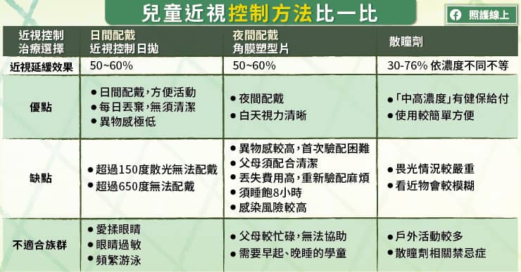 兒童近視矯正 專用日拋、角膜塑型片、散瞳藥水比一比 |2022.01.05 語音朗讀 726觀看次 字級 大 中 小 台灣兒童的近視盛行率高、高度近視的比例也高,是不容輕忽的健康議題。圖/unsplash 【本報台北訊】孩童的近視與長時間觀看電視有關?醫師說明,相較於閱讀、寫字、繪圖、或使用手機這些近距離用眼活動,反而比看電視的中距離,更容易增加近視的機率。「也常有人認為,戴眼鏡會使近視加深,所以故意不戴眼鏡。」麗明眼科診所院長陳祐瑲陳祐瑲醫師說,近視的成因主要是看太近、看太久、休息不足。年齡愈小罹患近視,未來愈可能出現高度近視,同時增加眼球病變的風險。積極控制近視,預防眼球病變正常光線經過水晶體的折射後,會聚焦在視網膜上,呈現清楚的影像,陳祐瑲指出,兒童近視的主要原因來自眼軸異常長,使得光線聚焦在視網膜之前,造成視力愈來愈模糊。近視是一種疾病,絕非單純的「戴眼鏡就好」,陳祐瑲強調,近視會導致眼球病變而增加青光眼、白內障、黃斑部病變、視網膜剝離的風險,嚴重可能失明,而戴眼鏡或接受近視雷射手術只能矯正視力,無法治療眼球的病變,若能將控制住近視不繼續加深成為高度近視,即能降低眼球病變風險。台灣兒童的近視盛行率高、高度近視的比例也高,是不容輕忽的健康議題。兒童近視控制可採用藥物治療、光學矯正、用眼控管等三個手段積極進行。兒童近視控制方式比一比目前常見的近視控制方式有藥物治療與光學矯正。藥物治療通常就是指散瞳劑,點長效散瞳藥水能夠放鬆眼睛的睫狀肌,有效控制近視度數。陳祐瑲分析,散瞳劑又可分為長效型與短效型、低濃度與高濃度,傳統上使用高濃度長效型散瞳劑可以維持較長時間的效果,但容易畏光,環境光比較強就會瞇瞇眼,看近物時也較模糊,且散瞳藥水必須長期使用才有持續控制近視的效果。「高濃度散瞳藥水會大幅阻斷看近的調節力,調節力變弱之後就對不到焦像類似老花眼,小朋友無法靠太近看東西,有助延緩近視進展,」陳祐瑲醫師說,「拉高散瞳藥水確實可增加療效,卻也可能影響閱讀、寫字等生活功能。」近期的主流趨勢則改以低濃度長效散瞳劑搭配足度全時光學矯正複方治療,可大幅減少畏光模糊等副作用。光學治療包括「近視控制專用日拋隱形眼鏡」及「角膜塑型片」。一般近視時配戴的矯正眼鏡能讓中央影像清楚聚焦於視網膜上,可以矯正視力但通常無法有效抑制近視成長。「近視控制專用日拋隱形眼鏡」與「角膜塑型片」皆為利用光學原理產生週邊離焦的效果,可幫助控制近視不易加深。「近視控制專用日拋隱形眼鏡」的特殊鏡片分為矯正區與控制區,光線透過矯正區將中央影像聚焦於視網膜上,讓配戴者看得清楚,而控制區會讓周邊影像聚焦於視網膜前,有助抑制眼軸變長、控制近視,同時達到看得清楚且可以控制近視繼續加深。「近視控制專用日拋」是軟式隱形眼鏡,異物感較低,可於白天配戴約10個小時左右,取下後即可丟棄,不需每天保養、清潔。相較於角膜塑型片,近視控制專用日拋的調整靈活性較高,若配戴過程中,度數有增加或減少,皆可適時調整。「角膜塑型片」類似硬式隱形眼鏡,可於夜間睡眠時配戴約8小時,早上起床後取下,陳祐瑲解釋,角膜塑型片能夠改變角膜的弧度,產生壓平的效果,進而改變角膜屈光度,將影像投影在視網膜上,也就是讓配戴者看得清楚,同時形成周邊離焦的效果,延緩眼軸增長速率而可控制近視繼續加深。近視兒童在取下角膜塑型片後,即可恢復清晰視力,所以白天可以不戴眼鏡,但某些反應不佳的患者身上可能出現較明顯的角膜弧度反彈現象,亦即經過幾個小時後,角膜逐漸恢復原狀而漸漸看不清楚,視力較不穩定。陳祐瑲分析,角膜塑型片可以控制孩童近視度數,但初期配戴可能會比較困難,且配戴時眼睛異物感需要一些時間適應。陳祐瑲提醒,為了確保角膜塑型片的使用安全,家長應每天協助幼童配戴、取下、並徹底清潔,以避免角膜受傷、感染等問題。陳祐瑲分析,夜間配戴「角膜塑型片」可能會因為睡眠時間、睡姿而影響隔日視力的清晰度;而「近視控制專用日拋」隱形眼鏡於白天配戴,能提供近視兒童清晰、穩定的視力。配戴角膜塑型片後需要有充足睡眠,較能發揮理想效果,不適合經常熬夜或短眠的患者。圖/unsplash「曾經有位使用角膜塑型片的患者,經常出現角膜破皮,而感到相當困擾。」陳祐瑲醫師分享,「經過討論之後,決定改用近視控制專用型日拋隱形眼鏡。因為停戴角膜塑型片後,近視會慢慢回復原來的度數,所以我們就從度數較輕的日拋型隱形眼鏡開始配戴,然後逐步往上調,順利解決了他的問題。」由於近視控制專用型日拋隱形眼鏡的操作門檻較低,將複雜的影響因素單純化,有助近視兒童長期使用,提升控制近視的成功率。陳祐瑲醫師說,日拋型隱形眼鏡較不適合經常游泳、眼睛嚴重過敏的近視兒童,因為常揉眼睛可能導致隱形眼鏡掉落。因為近視控制專用日拋需要長時間配戴,隱形眼鏡的材質就很重要,陳祐瑲醫師說,具有足夠的透氧度才能確保使用安全。貼心小提醒接受藥物治療、光學治療後,還是必須注意用眼習慣控管。陳祐瑲醫師提醒,中斷持續用眼行為,讓眼睛休息非常重要,建議使用「番茄時鐘法」,每用眼25分鐘就休息5分鐘,且須維持用眼距離,每天要有戶外活動,避免孩童