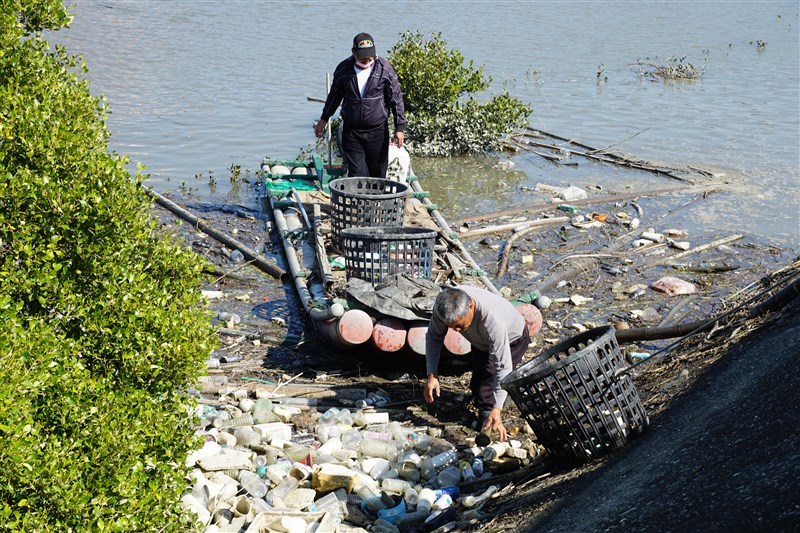 嘉義縣東石鄉農民張永琳(前)農閒時分乘膠筏在六腳大排檢垃圾。圖/莊祖銘