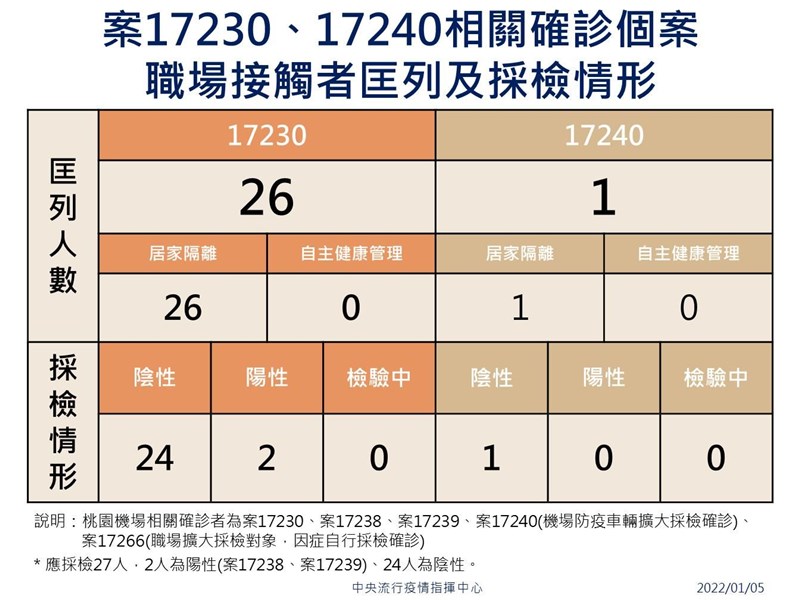 機場群聚累計5人 1清潔員、1司機皆染Omicron |2022.01.05 語音朗讀 1328觀看次 字級 大 中 小 國軍化學兵群前往染疫者足跡中壢區忠貞市場,進行大規模消毒。圖╱中央社 【本報台北訊】桃園機場群聚事件,自昨日有3名清潔員(案17230、案17238、案17239)及1名防疫計程車司機(案17240)確診,已針對外包清潔公司及防疫車隊採檢,今天凌晨再增1名清潔員確診列為案17266。中央流行疫情指揮中心指揮官陳時中表示,這1例新案與3例清潔員搭乘同一輛交通車上下班,但原先沒有匡列到,原因是原來清潔員並非此路線,而是後來因住家關係更改班次。陳時中說,案17266是值夜班,昨日下午本來安排今日上午上班,但因為全部清潔員要擴大篩檢,昨日下午有身體不舒服症狀,到社區採檢站篩檢後,結果為陽性。根據可能的感染源來看,陳時中表示,案17230是案號最早的,但無法定論是由他開始傳播,其衍生清潔員確診,共累計4位,都搭同班交通車,也針對防疫計程車隊擴大採檢,懷疑有共用場所的風險。陳時中指出,昨天查出案17240為防疫計程車司機,與最初案17230都是感染Omicron變異株,但定序還沒完全,另外3名還不知道定序結果。根據病毒量上升與否,這兩名Omicron確診者,案17230第一至二天病毒量往上升,到了高點往下降,案17266只有一次上升,剩餘其他三例都往下降,病毒量沒有增加,會對於最初感染原判定和整體傳播鍊有幫助。圖/指揮中心提供 前一篇文章 北市旅館確認群聚 定序均為Delta 1境外改本土 下一篇文章 國內4機場裝備升級 防疫車隊配給防水隔離衣 熱門新聞 01與精品品牌撞鞋 印度涼鞋打專利戰2025.12.2102佛光山高雄佛教堂 營建工地評鑑特優2025.12.1903太陽瓶燈泡 點亮貧困家庭希望 2025.12.1904銀杏點亮.東京印象2025.12.2305邂逅佛教 安頓身心2025.12.2106【時光重逢】花宅海邊美術館2025.12.1907【動物奧斯卡獎】猜猜誰最會演(上)2025.12.2108北島佛光山獲四星肯定 園林躍升具重要意義庭園2025.12.1909日球星率道奇連霸 2025體壇最驚奇 2025.12.1910社論--瞋恨的危害2025.12.21 訂閱電子報 台北市 天氣預報 台灣一週天氣預報 相關報導 台東昨6.1地震 氣象署:恐有餘震金門大膽島 年度熱搜景點余家昶捨身救人 明年入祀桃園忠烈祠好奇翹翹板 港都新趣處若遇恐怖攻擊 北市擬發細胞簡訊馬太鞍溪橋鋼便橋 元旦提前通行