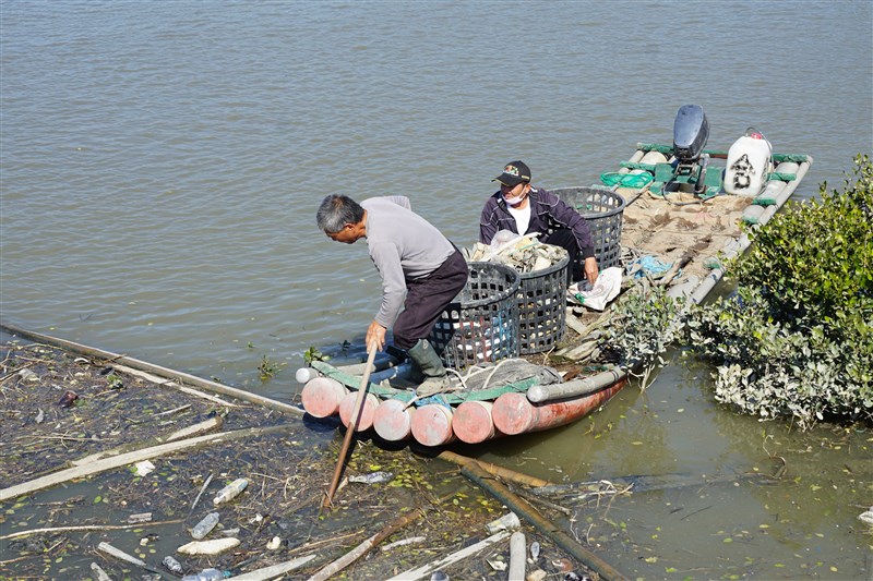 嘉義縣東石鄉農民張永琳(前)每年在河中撈起千噸垃圾。圖 /莊祖銘