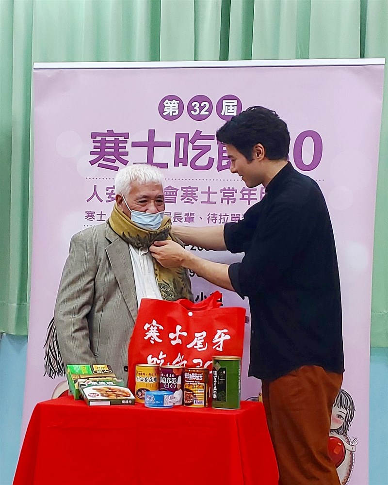 鳳小岳替寒士圍上圍巾,打扮得精神抖擻又溫暖。圖/人安基金會提供