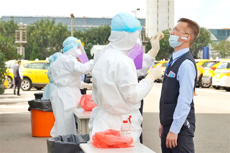 王必勝今到桃機前進指揮所工作會議,會後視察防疫計程車隊作業情況,他要求司機除使用口罩與手套,強烈建議使用隔離衣與隔板。圖/季相儒